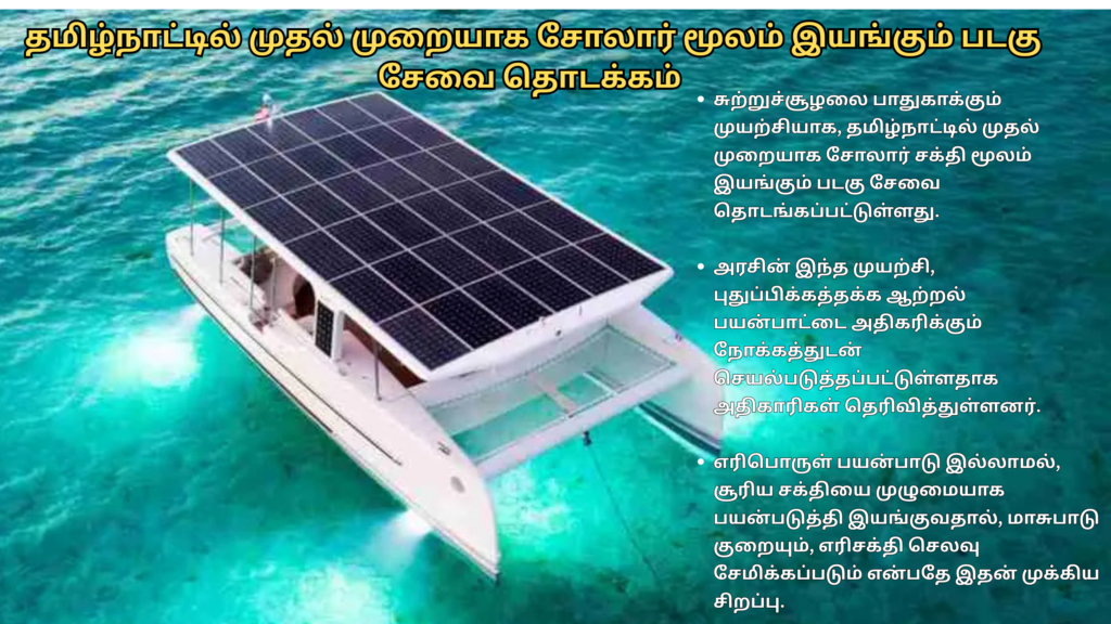 சுற்றுச்சூழலை பாதுகாக்கும் முயற்சியாக, தமிழ்நாட்டில் முதல் முறையாக சோலார் சக்தி மூலம் இயங்கும் படகு சேவை தொடங்கப்பட்டுள்ளது. இந்த புதிய முயற்சி, பசுமை ஆற்றல் பயன்பாட்டை ஊக்குவிக்கும் முக்கியமான அடியெடுப்பாக கருதப்படுகிறது.