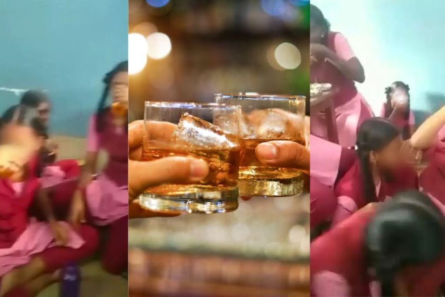 வைரலாகி வரும் வீடியோவில் பள்ளி சீருடையில் இருக்கும் 10-க்கும் மேற்பட்ட மாணவிகள் வகுப்பறைக்குள் வட்டமாக அமர்ந்துள்ளனர். பின்னர் ஒரு மாணவி பிளாஸ்டிக் டம்ளரில் சக மாணவிகளுக்கு சரக்கை ஊற்றி அதில் தண்ணீரை கலந்து கொடுப்பதும் போன்ற காட்சிகள் இடம் பெற்றுள்ளன.
