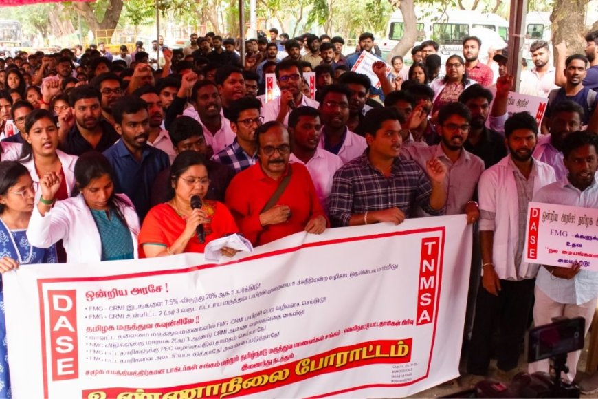 இந்த போராட்டத்திற்கு தலைமை தாங்கிய டாக்டர் ரவீந்திரநாத் நிருபர்களிடம் பேசியதாவது: மருத்துவக் கல்லூரிகளில் உள்ள மொத்த பயிற்சி மருத்துவர் இடங்களில் 20 விழுக்காடு அளவிற்கான இடங்களை வெளிநாட்டில் மருத்துவம் பயின்ற மருத்துவப் பட்டதாரிகளுக்கு வழங்கிட வேண்டும். மாவட்ட அரசு மருத்துவமனைகளிலும், வெளிநாட்டில் மருத்துவம் பயின்ற மருத்துவப் பட்டதாரிகளுக்கு பயிற்சி மருத்துவராக பயிற்சி பெற அனுமதி வழங்கிட தேசிய மருத்துவ ஆணையமே (NMC) 2022 ஆண்டிலேயே மாவட்ட அரசு மருத்துவமனைகளில் FMG பட்டதாரிகளை பயிற்சி மருத்துவராக பயிற்சி பெறலாம் என்ற அனுமதி வழங்கியுள்ளது.